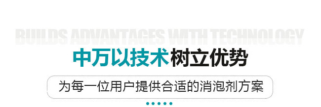 中萬(wàn)是一家以解決各行業(yè)泡沫難題為使命的企業(yè),專(zhuān)注于各行業(yè)不同工藝的泡沫應(yīng)用研究,擁有8大體系成分產(chǎn)品,近2000個(gè)不同行業(yè)、不同細(xì)分領(lǐng)域工藝的成功應(yīng)用經(jīng)驗(yàn)與解決方案,為您的生產(chǎn)工藝保駕護(hù)航。中萬(wàn)在化工泡沫領(lǐng)域扮演著重要的角色,從嚴(yán)謹(jǐn)?shù)倪x料到獨(dú)特的應(yīng)用方案,推動(dòng)著整個(gè)消泡劑行業(yè)的優(yōu)化升級(jí),中萬(wàn)因領(lǐng)先而備受推崇,用技術(shù)成就高效,提方案帶來(lái)卓越,讓服務(wù)適應(yīng)市場(chǎng),中萬(wàn)在消泡劑精益求精的道路上不斷地為客戶(hù)謀發(fā)展而開(kāi)拓創(chuàng)造。